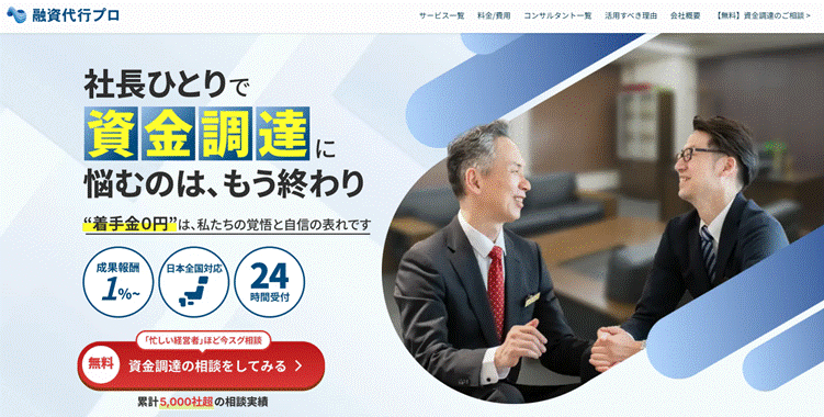 株式会社融資代行プロの創業融資支援は完全成果報酬型で、着手金がかかりません。また、元公庫職員や元銀行員など金融機関出身者がコンサルタントとして創業融資支援をサポートするとされています。