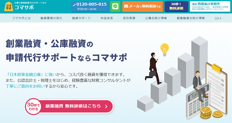 コマサポは、駒田会計事務所が手掛ける創業融資支援サービスです。会計事務所の専門財務スタッフが創業融資支援を担当し、日本政策金融公庫の創業融資の代行サポート実績は1,000件を超えるとされています。
