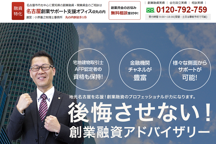 名古屋創業サポートオフィス@丸の内は、小原善之税理士事務所が手掛ける創業融資支援サービスです。年間100件以上の相談実績かつ融資成功率90%超の実績を有し、名古屋市を中心に創業融資支援を展開しているとされています。