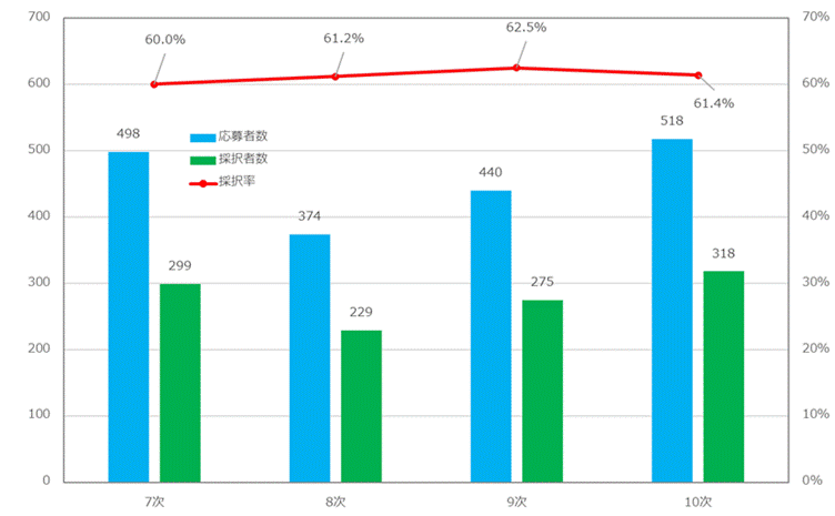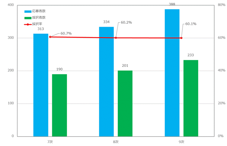| 公募回 | 申請者数 | 採択数 | 採択率(小数点第3位以下四捨五入) |